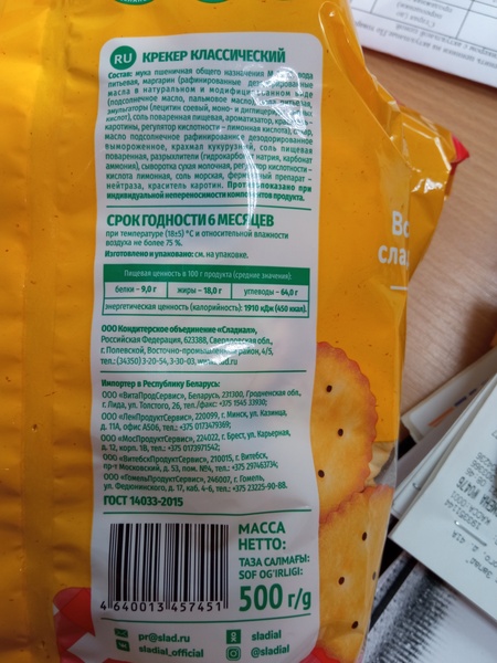 По результатам проведённых испытаний отобранной пищевой продукции в магазине «Fix-price», выявлена небезопасная продукция, не соответствующая требованиям ТР ТС 029/2012 «Требования безопасности пищевых добавок, ароматизаторов и технологических вспомогательных средств» ст. 9 п.1 – информация о составе продукции не содержит сведений о наличии пищевой добавки сернистая кислота и сорбиновая кислота и её соли сорбаты, или наименования функционального класса пищевой добавки, или индекс пищевой добавки, прил. 8 – по содержанию сернистой кислоты: крекер классический в полимерной упаковке, масса нетто 0,5 кг, код ТН ВЭД ЕАЭС 1905 90 450 0, штриховой код 4640013457451, дата изготовления 24.09.2021, срок годности 6 месяцев, изготовитель ООО Кондитерское объединение «Сладиал», Российская Федерация, 623388, Свердловская область, г. Полевской, Восточно-промышленный район, 4/5.