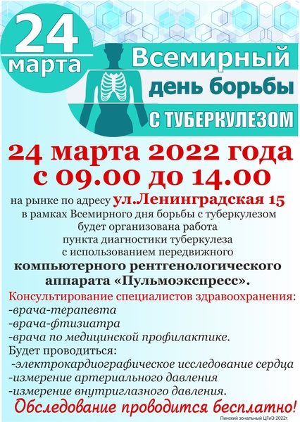 24 марта с 09.00 до 14.00 на рынке Пинского РайПО по адресу: ул.Ленинградская, 15, в рамках Всемирного дня борьбы с туберкулезом будет организована работа пункта диагностики туберкулеза с использованием передвижного компьютерного рентгенологического аппарата «Пульмоэкспресс», а также консультирование специалистов здравоохранения: врача-терапевта, врача-фтизиатра, врача по медицинской профилактике; будет проводится электрокардиографическое исследование сердца, измерение артериального и внутриглазного давления.