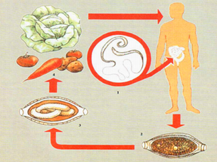 Аскаридоз – глистное заболевание чаще всего встречаемое у детей, вызывается аскаридами. Личинки и яйца аскарид попадают в организм с немытыми овощами,фруктами, яйца развиваются в кишечнике, затем они попадают в лимфатические и кровеносные сосуды, после чего с потоком крови попадают в печень, правый желудочек сердца, лёгкие. Оттуда в бронхи, трахею, глотку, полость рта. После повторного заглатывания в организме растут взрослые аскариды. Во время миграции личинок преобладают токсико-аллергические реакции — зуд в области носа, кашель, высыпания. Иногда бывает невысокая температура. Во время кишечной фазы присоединяются боли в животе, тошнота, слюнотечение, потеря аппетита, зуд в области ануса, вялость, сонливость. Диагностика: анализ крови или исследование кала в зависимости от фазы заболевания.
