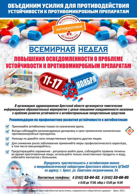 С 11 по 17 ноября 2023 года в Беларуси проводится Всемирная неделя повышения осведомленности о проблеме устойчивости к противомикробным препаратам (прежнее название – Всемирная неделя рационального использования антибиотиков).