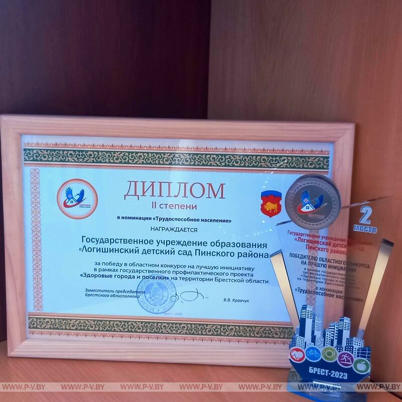 По итогам рассмотрения представленных материалов второе место в номинации «Трудоспособное население» занял коллектив ГУО «Логишинский детский сад Пинского района». Награду получил координатор проекта «Логишин – здоровый агрогородок» главный санитарный врач Пинского зонального ЦГиЭ Владимир Ващук. Затем диплом второй степени и сувенир был передан заведующей детским садом Инне Юшкевич.
