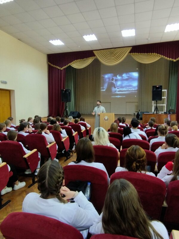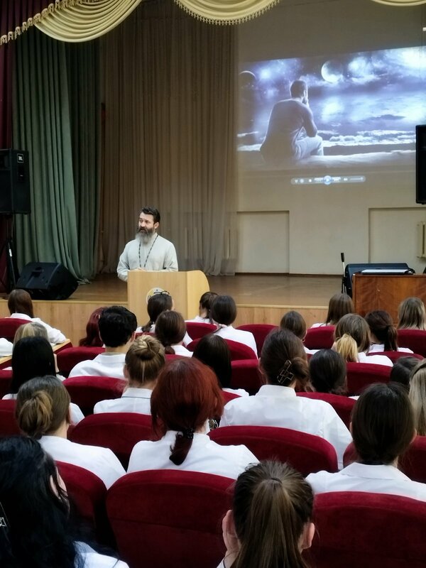 В рамках проведения месячника по формированию жизнеутверждающих установок 19 сентября в медицинском колледже прошла встреча со священником Сергием Плотницким на тему: «Ценностное отношение к жизни». Говорили о будущем, о профессии, о семье, о счастье. В завершении встречи посмотрели фильм «Камертон счастья», который имеет глубокий духовный и философский смысл. В целом встреча была интересная, познавательная, полезная для учащихся групп нового набора.