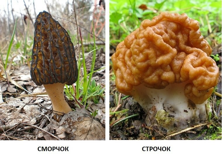 Сморчок – встречается в различных типах леса, на лесных вырубках и опушках. Плодовое тело достигает в высоту 10-30 см. Шляпка полая, желто-бурая, составляет от одной трети до двух третей длины ножки и может иметь округлую или остроконическую форму, по краям срастается с ножкой; состоит из ячеисто-сотовых углублений – альвеол, которые напоминают неровные пчелиные соты и формируются из ребер и мостиков, волнисто соединительных друг с другом. Ножка полая, ровная, продольно-борозчатая, буроватая. Окраска различных тонов: от светло-коричнево-желтоватого до серо- и оливково-коричневого; у сушеных – окраска чуть темнее, у отварных – значительно темнее. Мякоть беловатая, тонкая, ломкая, с приятным запахом и без особого вкуса. Споры бесцветные или желтоватые, гладкие, эллипсоидальные.