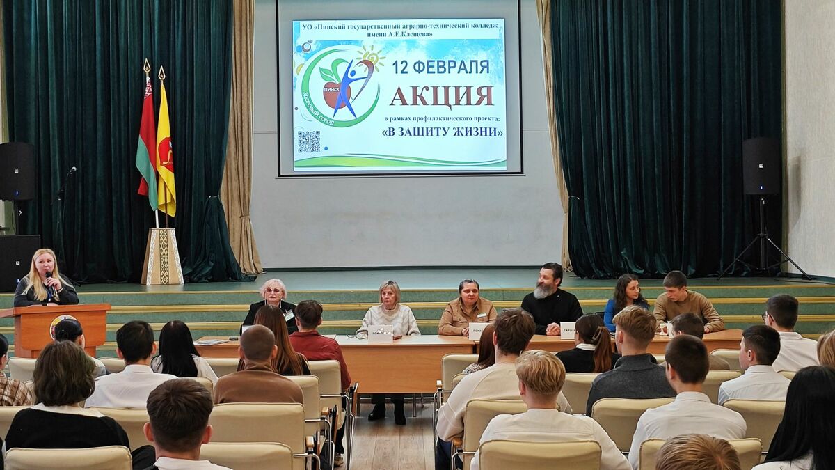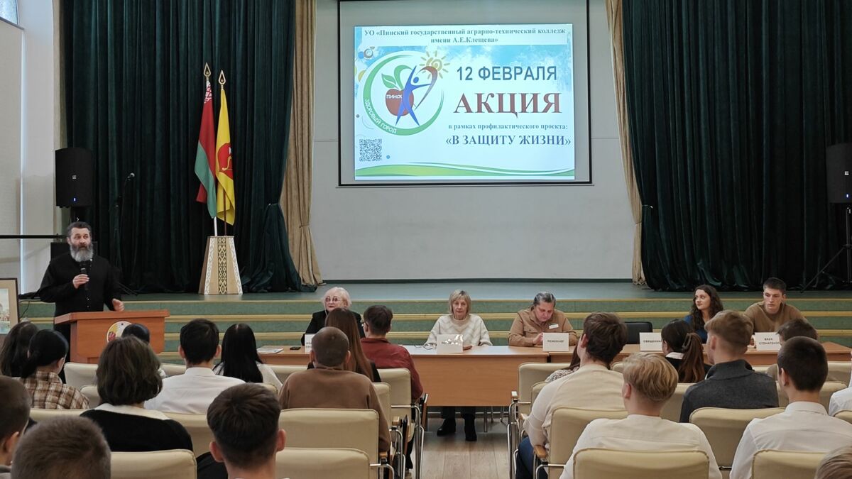 12 февраля на базе УО «Пинский государственный аграрно-технический колледж им. А.Е.Клещева», Пинским зональным центром гигиены и эпидемиологии в рамках профилактического проекта «В защиту жизни!», совместно с администрацией учреждения образования, учреждениями здравоохранения, Пинской епархией организован и проведен для учащихся вторых курсов семинар по формированию здорового образа жизни. Перед учащимися выступили: врач по медицинской профилактике отдела общественного здоровья и социально-гигиенического мониторинга Пинского зонального ЦГиЭ Бут- Гусаим Т.А., психолог филиала «Пинский межрайонный наркологический диспансер» УЗ «ПЦП» Кохнович Е.С., психолог филиала «Пинский межрайонный психоневрологический диспансер» УЗ «ПЦП» Шкабара С.С., священнослужитель, руководитель социального отдела, настоятель храма святого мученика цесаревича Алексия Пинской епархии Сергий Плотницкий. На мероприятии рассмотрены вопросы: по формированию здорового образа жизни, профилактики зависимостей, преодоления стрессовых ситуаций, репродуктивного здоровья и семейных ценностей, а также гигиены питания, гигиены полости рта и профилактики кариеса.